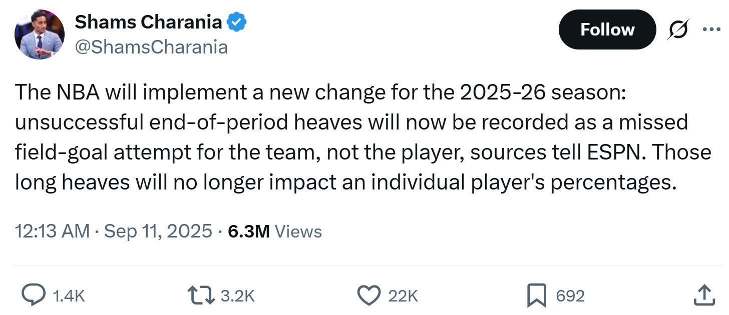 根据ESPN名记Shams报道,从25-26赛季开始,NBA将全面实施一项全新规定:末节最后阶段不中的远投不计入球员出手,而是计入球队投篮未中。
