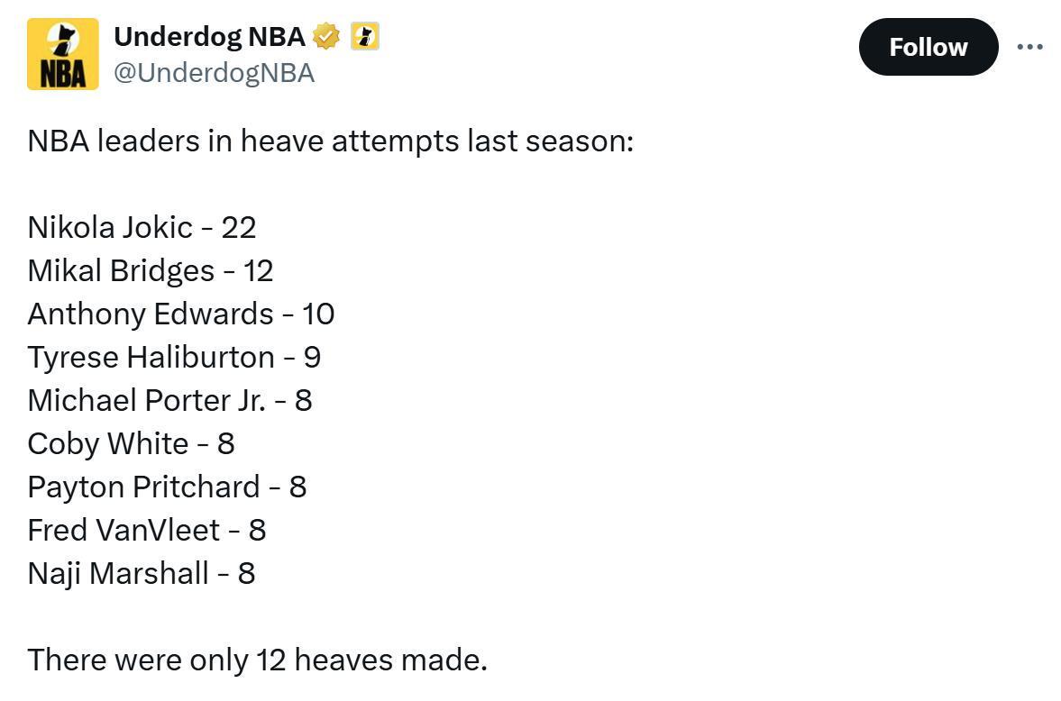 根据美媒统计,上个赛季约基奇一共出手22次压哨超远三分,断档高居联盟第一,是第二名布里奇斯与第三名爱德华兹加在一起的总和。
