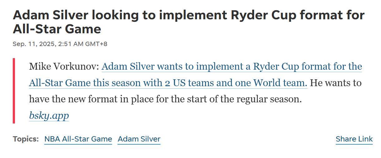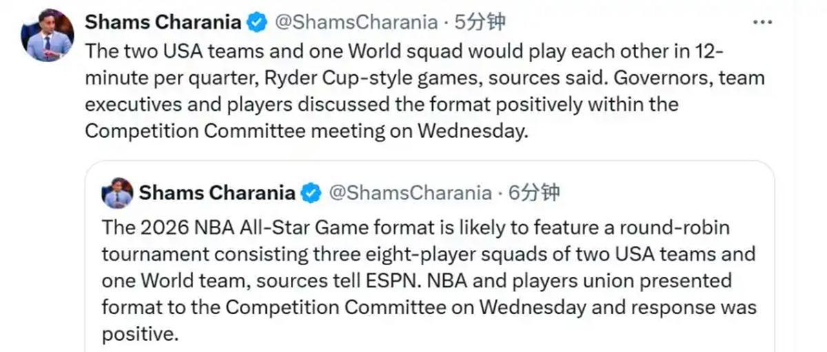 早在一周前名记Shams就率先曝出,NBA与球员工会已经向竞赛委员会提交了新赛季有关全明星赛制改革的建议,并且获得了积极回应。
