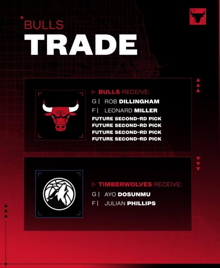 交易详情为:公牛送出道苏姆和菲利普斯,从森林狼换来迪林厄姆、伦纳德·米勒、4个次轮签。